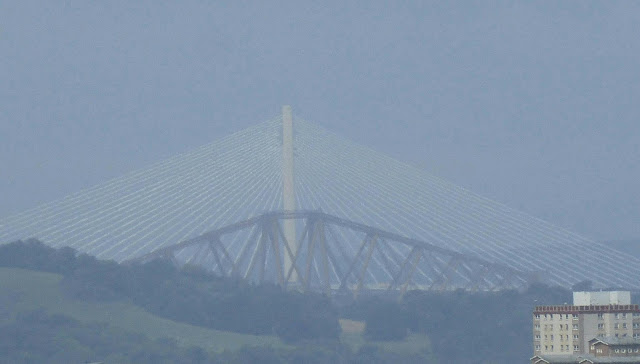 La pluie a noyé l'estuaire du Firth of Forth et notre île aux oiseaux est gommée dans la grisaille. Au fond de l'estuaire, les trois ponts se concurrencent, les piliers des haubans du plus récent se perdent dans le ciel si bas. Retour à une réalité, météorologique et routière avec la rocade d'Edimbourg, le parking relais et l'attendu bus à impériale.